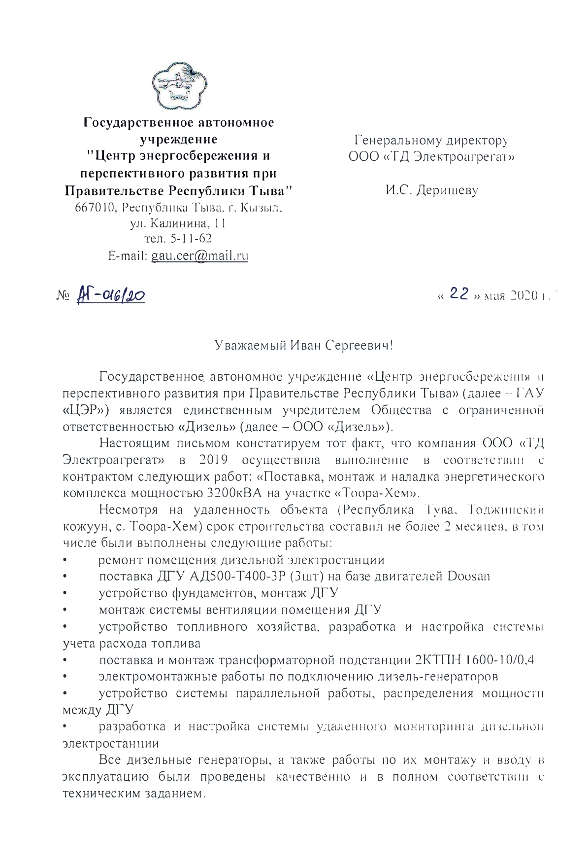 Отзыв контрагентов о компании ООО «ТД Электроагрегат» и  исполненном проекте для ГАУ "Центр энергосбережения и перспективного развития при Правительстве Республики Тыва"