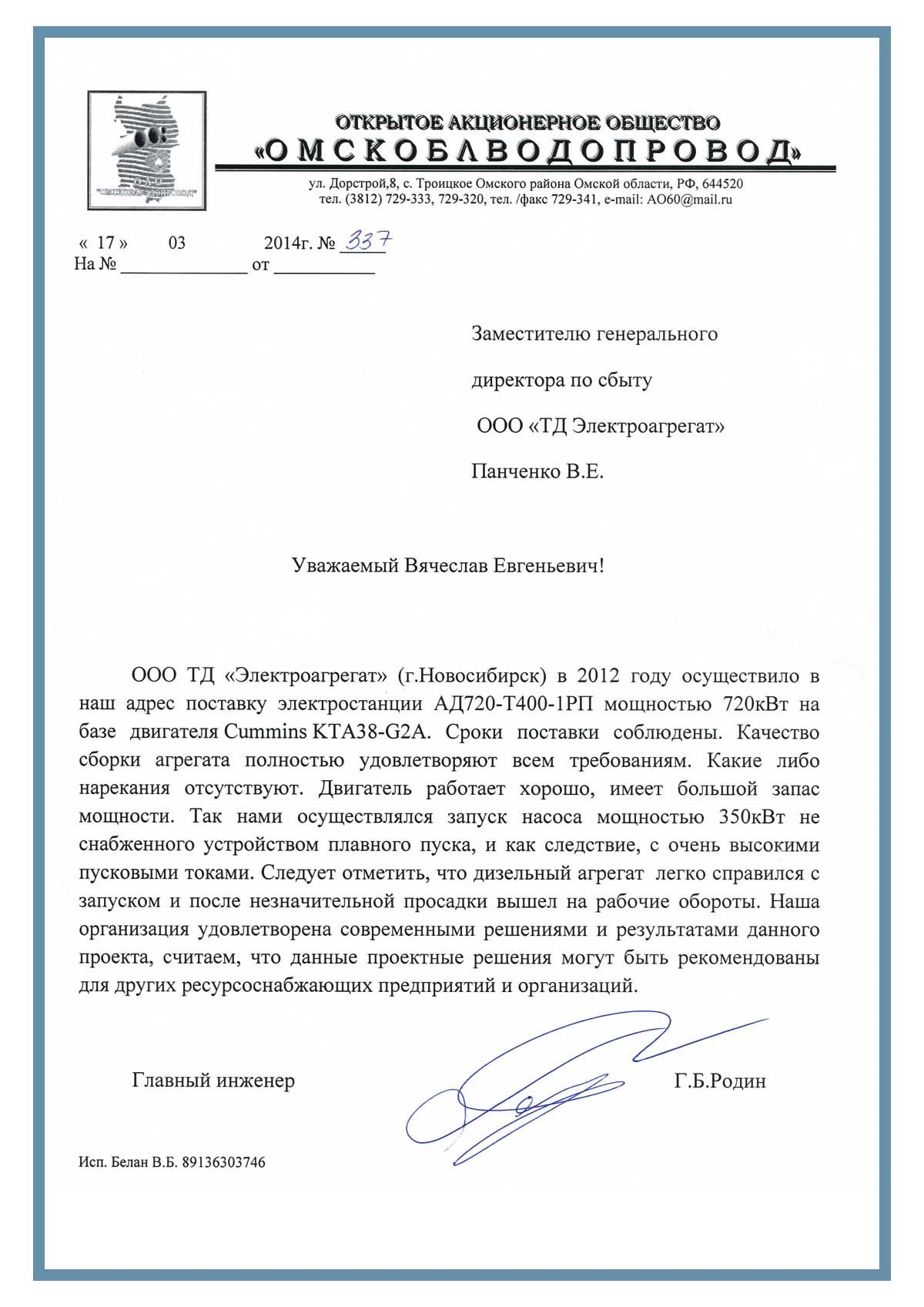 Отзыв контрагентов о компании ООО «ТД Электроагрегат» и  исполненном проекте для ОАО "Омскоблводопровод" Омская обл.